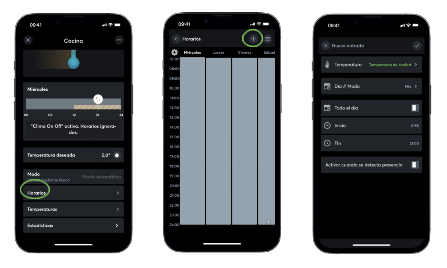 - Definir la temperatura deseada, seleccionar día(s) de la semana y establecer horas de inicio y fin.